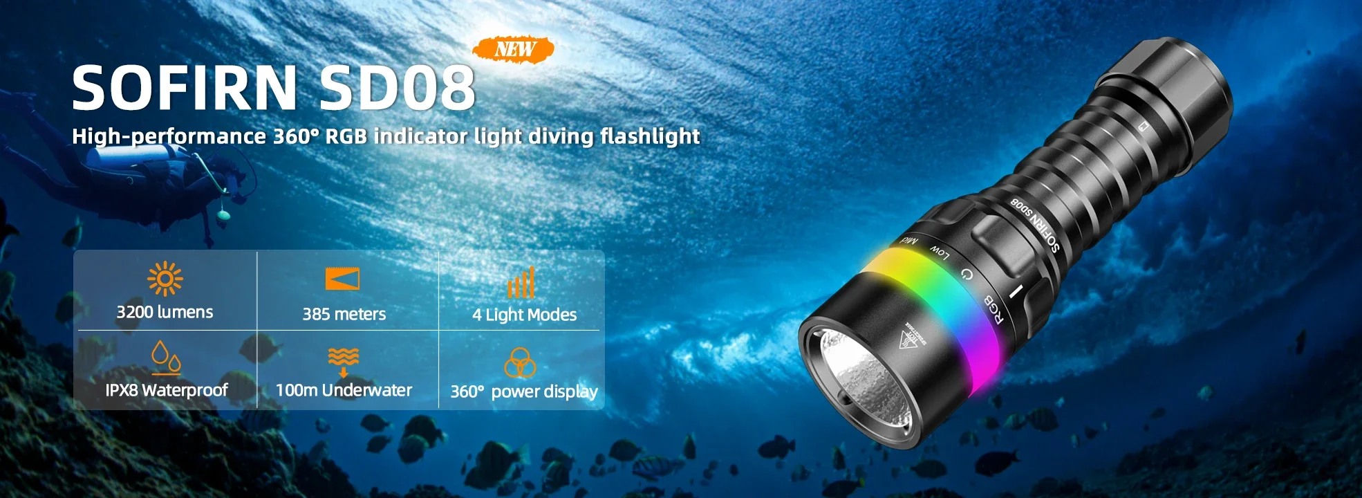 SOFIRN SD08 is a high-performance diving flashlight with its high mode reaching 3200 lumensand an impressive beam distance of 385 meters.